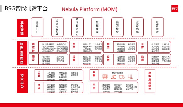 整体而言,BSG-MOM系统的核心是MES,该平台较低的层是为了更多满足客户的共性需求而设计,通过更好的产品化、平台化,促进复用、降低成本,而上层更多的为了满足个性化需求,通过客户化定制工具实现模块化选配、可视化建模、个性化开发快速满足客户个性化需求。